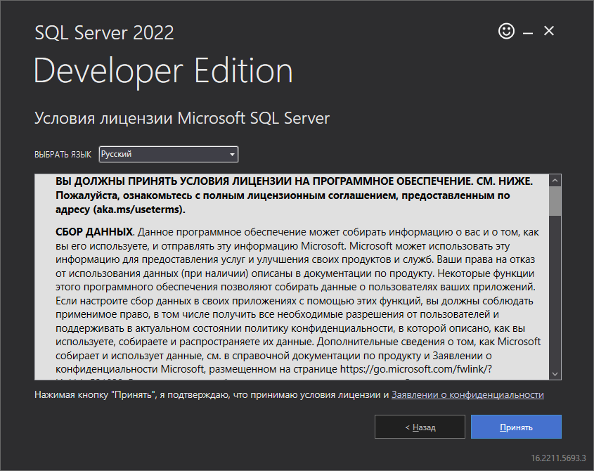 (3) Выбираем язык (по умолчанию русский), затем жмем кнопку принять