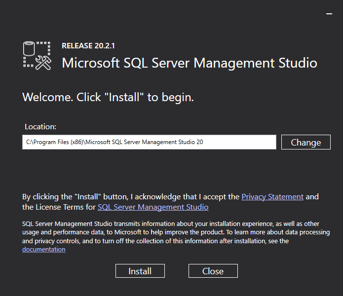 (5) После скачивания SSMS открываем .exe файл. Путь оставляем по умолчанию затем жмем install