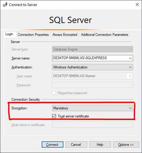 (8) В Server name ставим DESKTOP-.. (наш пк) В Authentication ставим Windows Authentication В Encryption выбираем Mandatory и ставим галочку (Trust server certificate) После этого нажимаем connect