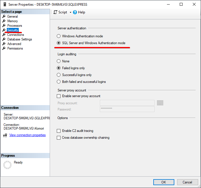 (2) Security затем жмем SQL Server and Windows Authentication mode