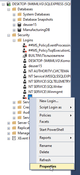 (4) раскрываем папку Security затем Logins после чего нажимаем правой кнопкой мыши по “sa” затем properties