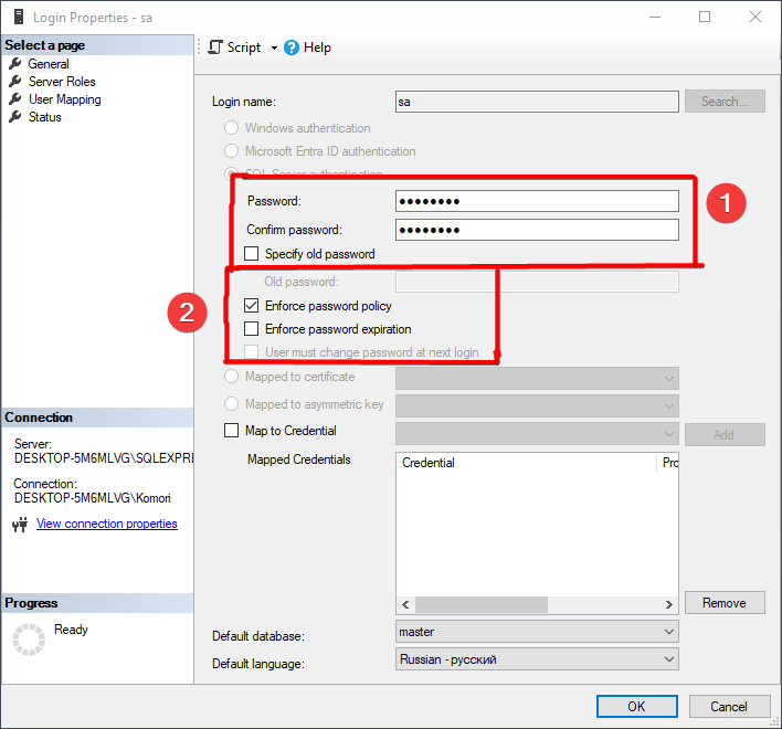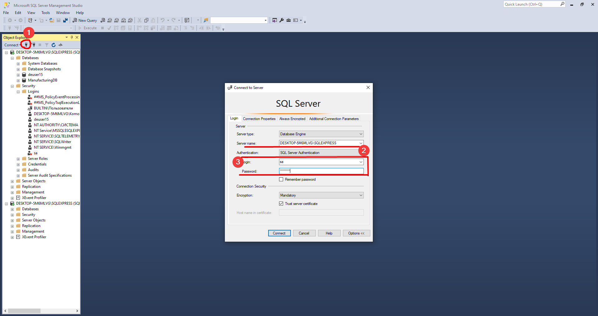 (6) 1 - Жмем “вилку” 2 - В Authentication выбираем SQL Server Authentication 3 - Пишем Login: sa Password: “ваш пароль”