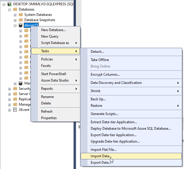 (1) Кликаем правой кнопкой мыши по БД deuser далее: Tasks / Import data…
