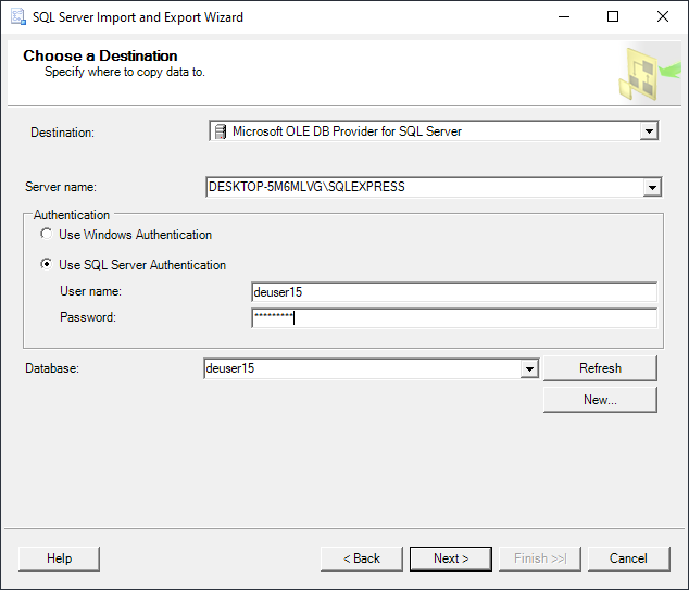 (3) Нажимаем Use SQL Server Authentication. Вводим имя и пароль. После кликаем next