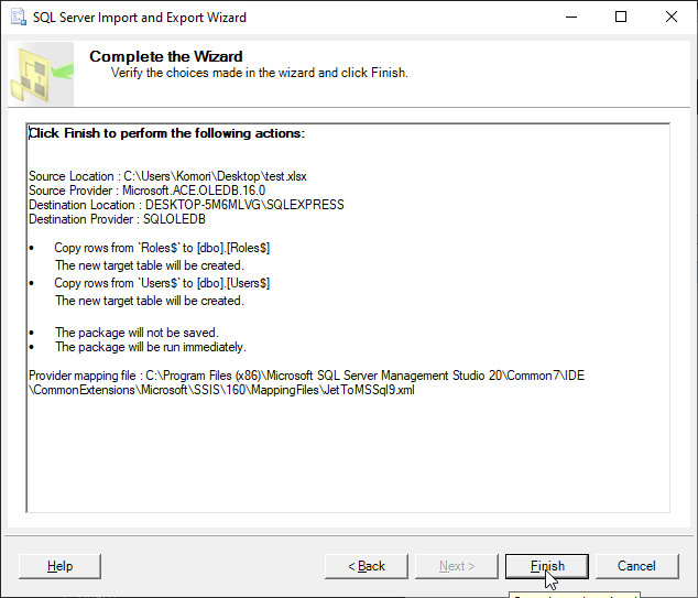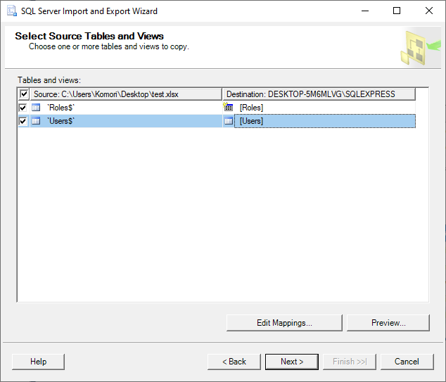 (5) Прожимаем галочки на табличках. Затем нажимаем по одной из таблиц в колонке Destination. Кликаем по полю и изменяем названия будущих таблиц (это нужно чтобы избежать знак $)