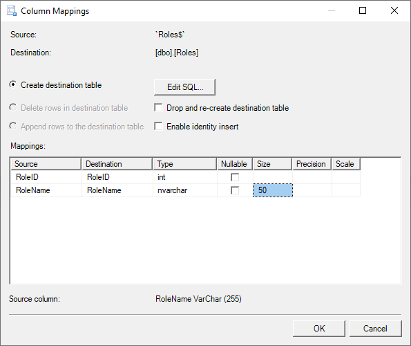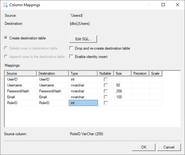 Нажимаем на нужную табличку после чего Edit Mappings… и настраиваем все в соответствии с заданием Data Type - тип данных Allow Nulls - галочки нет (NOT NULL) / галочка есть (NULL)