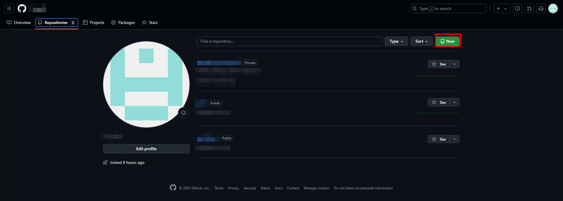 (7) Переходим в профиль затем жмем Repositories, после чего создаем новый репозиторий при помощи кнопки New