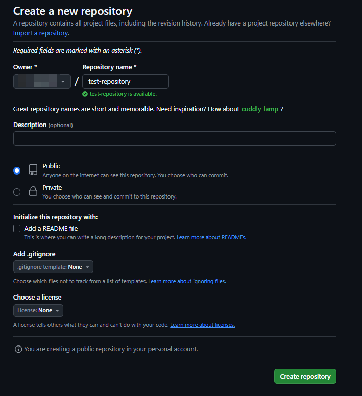 (8) В Repository name пишем имя своего репозитория, по желанию можно добавить описание (Description). Ставим галочку на Public (чтобы сделать наш репозиторий просматриваемым для всех). Остальное можем не трогать. Нажимаем зеленую кнопку Create repository